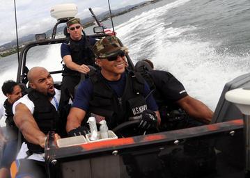 Keywords: US Navy 090204-N-9758L-135 National Football League Pro Bowl players Tennessee Titans Chris Hope and New York Giants Justin Tuck shouts with excitement while making a sharp turn during a rigid hull inflatable boat tour.jpg en PEARL HARBOR Hawaii Feb 4 2009 National Football League Pro Bowl players Tennessee Titans Chris Hope and New York Giants Justin Tuck shouts with excitement while making a sharp turn during a rigid hull inflatable boat tour with Sailors assigned to Afloat Training Group Middle Pacific ATG MIDPAC as part of a tour of ATG MIDPAC headquarters at historic Ford Island Eight NFL players received tours of Pearl Harbor including tours of the Pearl Harbor-based guided-missile destroyer USS Chafee DDG 90 and the Sea-Based X-band Radar U S Navy photo by Mass Communication Specialist 2nd Class Michael A Lantron/Released 2009-02-04 090204-N-9758L-135 Navy http //www navy mil/view_image asp id 68613 U S Navy photo by Mass Communication Specialist 2nd Class Michael A Lantron PD-USGov-Military-Navy 2009 in Pearl Harbor Images from US Navy location Pearl Harbor Hawaii USS Chafee DDG-90 Justin Tuck |