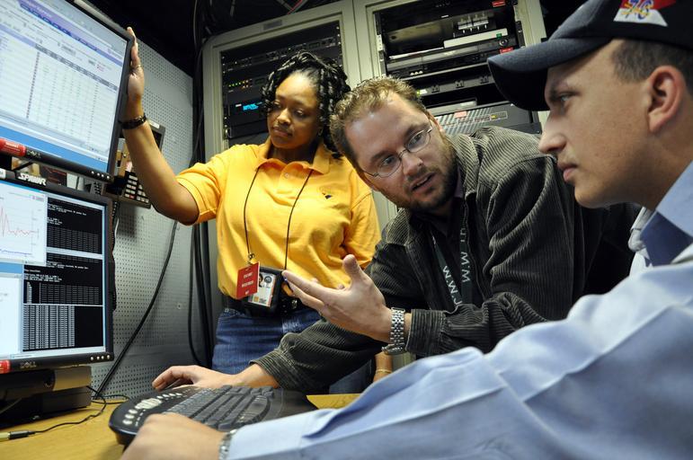| Keywords: US Navy 090310-D-5972N-002 Civilian employees work with Information Systems Technician 2nd Class James Rago to troubleshoot the video teleconference system of a video information exchange system.jpg en SAN DIEGO Calif March 10 2009 Fran White left a civil service employee at Space and Naval Warfare Systems Command Systems Center Atlantic and Clayton Bush a Tactical Networks PMW-160 contractor work with Information Systems Technician 2nd Class James Rago to troubleshoot the video teleconference system of a video information exchange system aboard the aircraft carrier USS Ronald Reagan CVN 76 PMW-160 and SPAWAR provide the Navy with network fabric and services used by multiple shipboard tactical and business applications and systems and routinely install maintain and train crewmembers in operational and maintenance procedures U S Navy photo by Rick Naystatt/Released 2009-03-10 090310-D-5972N-002 Navy http //www navy mil/view_image asp id 69984 U S Navy photo by Rick Naystatt PD-USGov-Military-Navy Aboard USS Ronald Reagan CVN-76 Naval Base San Diego in the 2000s |