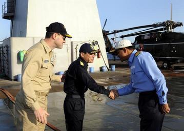 | Keywords: US Navy 090502-N-7280V-023 Indian Navy Rear Adm. Anurag G. Thapliyal, Flag Officer Commanding Eastern Naval Command, and Japan Maritime Self-Defense Force Rear Adm. Hitoshi Noguchi greet each other.jpg en PACIFIC OCEAN May 2 2009 Indian Navy Rear Adm Anurag G Thapliyal Flag Officer Commanding Eastern Naval Command and Japan Maritime Self-Defense Force Rear Adm Hitoshi Noguchi greet each other as they are escorted by Vice Adm John M Bird Commander U S 7th Fleet aboard the amphibious command ship USS Blue Ridge LCC 19 The admirals were aboard for breakfast in the Admiral's cabin at the conclusion of Exercise Malabar 2009 The Japan Maritime Self Defense Force JMSDF and U S Navy are participating in Malabar an annual exercise led by the Indian Navy U S Navy photo by Mass Communication Specialist 3rd Class Daniel Viramontes/Released 2009-05-02 090502-N-7280V-023 Navy http //www navy mil/view_image asp id 71215 U S Navy photo by Mass Communication Specialist 3rd Class Daniel Viramontes PD-USGov-Military-Navy Malabar 2009 Aboard USS Blue Ridge LCC-19 John M Bird Admirals of the JMSDF Admirals of India Handshakes involving the military |