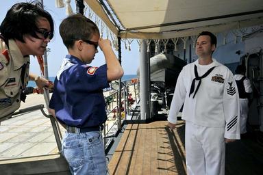 Keywords: US Navy 090503-N-7478G-051 A Cub Scout from Boy Scout Pack 112 from Camp Foster, Okinawa salutes Interior Communications Electrician 1st Class Jon Forrer as he comes aboard the amphibious command ship USS Blue Ridge (LCC 19).jpg en OKINAWA Japan May 3 2009 A Cub Scout from Boy Scout Pack 112 from Camp Foster Okinawa salutes Interior Communications Electrician 1st Class Jon Forrer as he comes aboard the amphibious command ship USS Blue Ridge LCC 19 for a ship's tour U S Navy photo by Mass Communication Specialist 2nd Class Cynthia Griggs/Released 2009-05-03 090503-N-7478G-051 Navy http //www navy mil/view_image asp id 71218 U S Navy photo by Mass Communication Specialist 2nd Class Cynthia Griggs x100px PD-USGov-Military-Navy Aboard USS Blue Ridge LCC-19 Images from US Navy location Okinawa Japan Interior Communications Electrician Cub Scouting Boy Scouts of America American Scouting overseas |