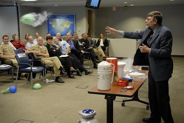 Keywords: US Navy 090519-N-7676W-106 Dr. William D. Phillips, from the National Institute of Standards and Technology and recipient of the 1997 Nobel Prize in physics, demonstrates the effects of liquid nitrogen on balloons.jpg en ARLINGTON Va May 19 2009 Dr William D Phillips from the National Institute of Standards and Technology and recipient of the 1997 Nobel Prize in physics demonstrates the effects of liquid nitrogen on balloons during a lecture to Office of Naval Research employees and guests Phillips spoke about his work as a leading researcher in laser cooling and trapping of atoms during the Director of Innovation's distinguished lecture series These fundamental studies are used to develop applications for new kinds of physics measurements and processes such as high resolution spectroscopy atomic clocks atomic collisions atom optics bio-molecular interactions and atomic-scale and nano-scale fabrication U S Navy photo by John F Williams/Released 2009-05-19 090519-N-7676W-106 Navy http //www navy mil/view_image asp id 71810 U S Navy photo by John F Williams PD-USGov-Military-Navy Arlington County Virginia William Daniel Phillips |
