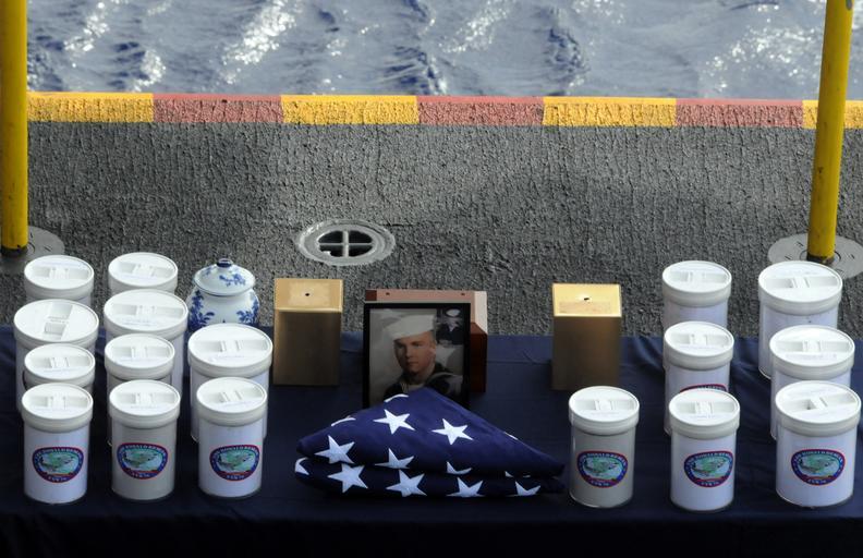 | Keywords: US Navy 090609-N-3610L-073 The ashes of service members and their spouses are arranged on a table during a burial at sea ceremony aboard the aircraft carrier USS Ronald Reagan (CVN 76).jpg en PACIFIC OCEAN June 9 2009 The ashes of service members and their spouses are arranged on a table during a burial at sea ceremony aboard the aircraft carrier USS Ronald Reagan CVN 76 Capt K J Norton commanding officer of Ronald Reagan spoke to the crew and reminded them as they serve on Ronald Reagan their families are part of the Ronald Reagan family These words were held evident as a photo of Edmond McKinley Myers father of Ronald Reagan Sailor Boatswain's Mate 1st Class Ryan Myers was displayed among the ashes Ronald Reagan is on a routine deployment to the western Pacific Ocean U S Navy photo by Mass Communication Specialist 3rd Class Torrey W Lee/Released 2009-06-09 090609-N-3610L-073 Navy http //www navy mil/view_image asp id 72497 U S Navy photo by Mass Communication Specialist 3rd Class Torrey W Lee PD-USGov-Military-Navy Sea burials aboard USS Ronald Reagan CVN-76 |