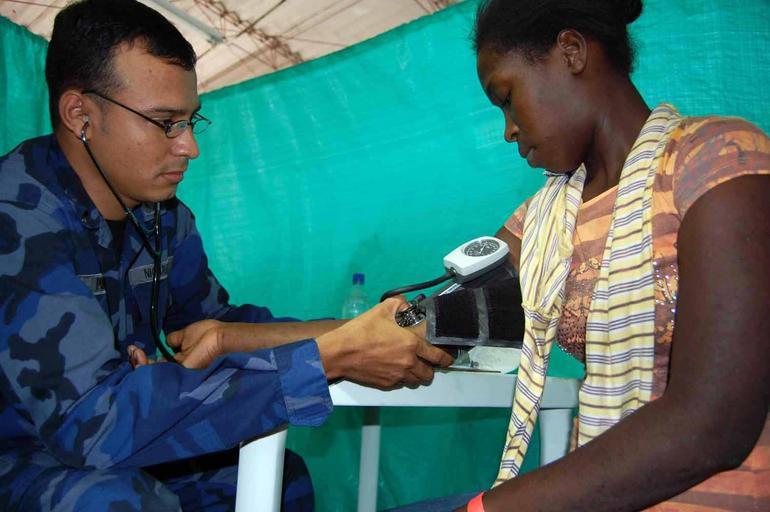 Keywords: US Navy 090611-F-5647K-019 Lt Carlos Perez, a Nicaraguan navy doctor aboard hospital ship USNS Comfort (T-AH 20) checks a Colombian patient's blood pressure.jpg en TUMACO Colombia June 11 2009 Lt Carlos Perez a Nicaraguan navy doctor aboard hospital ship USNS Comfort T-AH 20 checks a Colombian patient's blood pressure Comfort is deployed on the four-month Continuing Promise 2009 humanitarian and civic assistance mission to Latin America and the Caribbean region Continuing Promise combines U S military and interagency personnel non-governmental organizations civil service mariners academic and partner nations to provide medical dental veterinary and engineering services afloat and ashore alongside host nation personnel U S Air Force photo by Airman 1st Class Clara Karwacinski/Released 2009-06-11 090611-F-5647K-019 Navy http //www navy mil/view_image asp id 72660 U S Air Force photo by Airman 1st Class Clara Karwacinski PD-USGov-Military-Navy Images from US Navy location TUMACO Colombia Aboard USNS Comfort T-AH-20 |