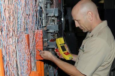 | Keywords: US Navy 090709-N-2143T-002 Electronics Technician 1st Class Harold Duffey from Port Orchard, Wash., tests phone lines with a phone tester.jpg en SILVERDALE Wash July 9 2009 Electronics Technician 1st Class Harold Duffey from Port Orchard Wash tests phone lines with a phone tester at Naval Computer and Telecommunications Area Master Station Pacific Detachment Puget Sound U S Navy photo by Mass Communication Specialist 2nd Class Maebel Tinoko/Released 2009-07-09 090709-N-2143T-002 Navy http //www navy mil/view_image asp id 73677 U S Navy photo by Mass Communication Specialist 2nd Class Maebel Tinoko PD-USGov-Military-Navy People at Naval Base Kitsap Electronics Technician |