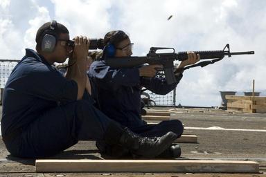 | Keywords: US Navy 090825-N-9123L-061 Fire Controlman 2nd Class Jesse Martinez acts as a spotter as Cryptologic Technician (Technical) 2nd Class Petrice Rodriguez fires an M-16 rifle.jpg en PACIFIC OCEAN Aug 25 2009 Fire Controlman 2nd Class Jesse Martinez acts as a spotter as Cryptologic Technician Technical 2nd Class Petrice Rodriguez fires an M-16 rifle during small arms qualifications aboard the guided-missile destroyer USS McCampbell DDG 85 The ship is one of seven Arleigh Burke-class guided-missile destroyers assigned to Destroyer Squadron 15 and is permanently forward-deployed to Yokosuka Japan U S Navy photo by Mass Communication Specialist 2nd Class Byron C Linder/Released 2009-08-25 090825-N-9123L-061 Navy http //www navy mil/view_image asp id 75585 U S Navy photo by Mass Communication Specialist 2nd Class Byron C Linder PD-USGov-Military-Navy Fire Controlman Aboard USS McCampbell DDG-85 M16 rifle cartridge ejections |