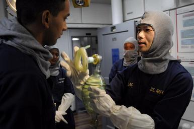 Keywords: US Navy 091021-N-3830J-055 Cmdr. Tri Lac, medical officer demonstrates the proper use of an air mask to hospital corpsmen and stretcher bearers in the main battle dressing station during a general quarters drill.jpg en PACIFIC OCEAN Oct 21 2009 Cmdr Tri Lac medical officer demonstrates the proper use of an air mask to hospital corpsmen and stretcher bearers in the main battle dressing station during a general quarters drill aboard the Amphibious Command ship USS Blue Ridge LCC 19 U S Navy photo by Mass Communication Specialist 3rd Class Matthew D Jordan/Released 2009-10-21 091021-N-3830J-055 Navy http //www navy mil/view_image asp id 77609 U S Navy photo by Mass Communication Specialist 3rd Class Matthew D Jordan PD-USGov-Military-Navy Aboard USS Blue Ridge LCC-19 Anti-flash gear
