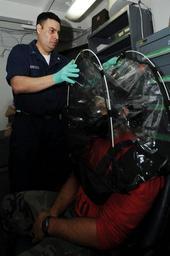 Keywords: US Navy 091124-N-3038W-080 Damage Controlman 3rd Class Richard Mendoza assists Aviation Ordnanceman 2nd Class Oscar Diaz with a gas mask fitting.jpg en GULF OF OMAN Nov 24 2009 Damage Controlman 3rd Class Richard Mendoza assists Aviation Ordnanceman 2nd Class Oscar Diaz assigned to the Indians of Helicopter Anti-Submarine Squadron HS 6 with a gas mask fitting aboard the aircraft carrier USS Nimitz CVN 68 The Nimitz Carrier Strike Group is on a routine deployment to the U S 5th Fleet area of responsibility U S Navy photo by Mass Communication Specialist 3rd Class John Phillip Wagner Jr /Released 2009-11-24 091124-N-3038W-080 Navy http //www navy mil/view_image asp id 78867 U S Navy photo by Mass Communication Specialist 3rd Class John Phillip Wagner Jr PD-USGov-Military-Navy Aboard USS Nimitz CVN-68 Aviation Ordnanceman |