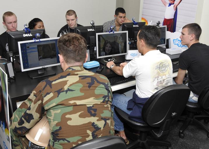 | Keywords: US Navy 091126-N-8721D-020 Sailors speak with friends and family in the U.S. from webcam-enabled computer terminals at the Fleet Activities Yokosuka USO.jpg en YOKOSUKA Japan Nov 26 2009 Sailors speak with friends and family in the U S from webcam-enabled computer terminals at the Fleet Activities Yokosuka USO The USO staff and volunteers hosted a Thanksgiving meal gave away door prizes offered webcam calls and free 30-minute Skype phone cards U S Navy photo by Mass Communication Specialist Seaman Devon Dow/Released 2009-11-26 091126-N-8721D-020 Navy http //www navy mil/view_image asp id 78935 U S Navy photo by Mass Communication Specialist Seaman Devon Dow PD-USGov-Military-Navy United States Fleet Activities Yokosuka |