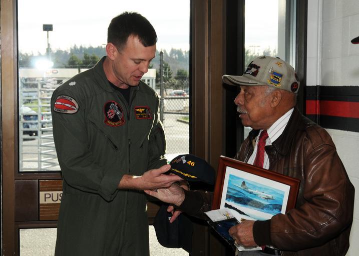 Keywords: US Navy 100116-N-9860Y-003 Cmdr. Mark Hamilton, commanding officer of the Grey Knights of Patrol Squadron (VP) 46, presents a command photo and ball cap to retired U.S. Air Force Lt. Col. William Holloman III.jpg en OAK HARBOR Wash Jan 16 2010 Cmdr Mark Hamilton commanding officer of the Grey Knights of Patrol Squadron VP 46 presents a command photo and ball cap to retired U S Air Force Lt Col William Holloman III a former Tuskegee Airmen from the 99th Fighter Squadron 332nd Fighter Group Holloman was on a tour of Hangar 7 at Naval Air Station Whidbey Island as part of a Pacific West Aerospace Academy visit to assist underprivileged inner-city youth in creating a career in aviation U S Navy photo by Mass Communication Specialist 2nd Class Tucker M Yates/Released 2010-01-16 100116-N-9860Y-003 Navy http //www navy mil/view_image asp id 80280 U S Navy photo by Mass Communication Specialist 2nd Class Tucker M Yates PD-USGov-Military-Navy Images from US Navy location OAK HARBOR Wash |
