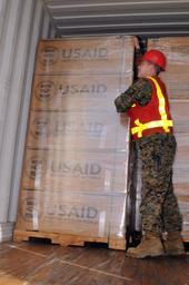 | Keywords: US Navy 100118-N-1522S-003 Marine Staff Sgt. Jonathon Thompson inspects cargo from the U.S. Agency for International Development (USAID) and the Marine Corps at Blount Island Command, Jacksonville, Fla.jpg en JACKSONVILLE Fla Jan 18 2010 Marine Staff Sgt Jonathon Thompson inspects cargo from the U S Agency for International Development USAID and the Marine Corps at Blount Island Command Jacksonville Fla before loading it aboard the Military Sealift Command maritime prepositioning ship USNS 1st Lt Jack Lummus T-AK-3011 USAID provided more than 120 pallets of relief supplies and 400 bottles of propane The Marine Corps cargo included vehicles and heavy equipment to support the distribution of supplies water production water distribution and fuel distribution The Marines also provided limited earth-moving equipment electrical-producing equipment limited lumber building materials and medical supplies The ship and supplies are bound for Haiti as part of Operation Unified Response providing humanitarian assistance and disaster relief in the aftermath of a 7 0 magnitude earthquake on Jan 12 2010 U S Navy photo by Mass Communication Specialist 1st Class Leah Stiles/Released 2010-01-18 100118-N-1522S-003 Navy http //www navy mil/view_image asp id 80230 U S Navy photo by Mass Communication Specialist 1st Class Leah Stiles PD-USGov-Military-Navy Images from US Navy location Jacksonville Florida USNS 1st Lt Jack Lummus T-AK-3011 |
