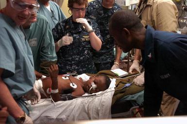 | Keywords: US Navy 100119-N-8366W-067 Medical professionals aboard the Military Sealift Command hospital ship USNS Comfort (T-AH 20) treat a six-year-old Haitian boy in the casualty receiving room aboard the 1,000-bed hospital ship.jpg en ATLANTIC OCEAN Jan 19 2010 Medical professionals aboard the Military Sealift Command hospital ship USNS Comfort T-AH 20 treat a six-year-old Haitian boy in the casualty receiving room aboard the 1 000-bed hospital ship The boy transferred to Comfort by helicopter from the aircraft carrier USS Carl Vinson CVN 70 for treatment for an injury to his bladder and a hip fracture during an earthquake that struck Haiti on Jan 12 The boy is in the intensive care unit aboard Comfort in stable condition Comfort is supporting Operation Unified Response a joint operation providing humanitarian assistance to Haiti U S Navy photo by Mass Communication Specialist 3rd Class Timothy Wilson/Released 2010-01-19 100119-N-8366W-067 Navy http //www navy mil/view_image asp id 80275 U S Navy photo by Mass Communication Specialist 3rd Class Timothy Wilson PD-USGov-Military-Navy Aboard USS Carl Vinson CVN-70 |