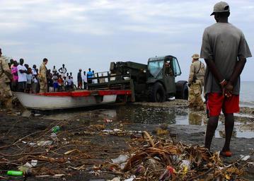 | Keywords: US Navy 100119-N-5244H-015 A fisherman watches as members of Beach Master Unit (BMU) 2 clear a damaged boat away from the shoreline to make way for landing craft air cushion vehicles transporting heavy equipment and supplies.jpg en BONEL Haiti Jan 19 2010 A fisherman watches as members of Beach Master Unit BMU 2 clear a damaged boat away from the shoreline to make way for landing craft air cushion vehicles transporting heavy equipment and supplies from the multi-purpose amphibious assault ship USS Bataan LHD 5 Bataan along with the amphibious dock landing ships USS Fort McHenry LSD 43 USS Gunston Hall LSD 44 and USS Carter Hall LSD 50 is participating in Operation Unified Response providing military support capabilities to civil authorities to help stabilize and improve the situation in Haiti following a 7 0 magnitude earthquake that devastated the country Jan 12 U S Navy photo by Mass Communication Specialist 1st Class Monique Hilley/Released 2010-01-19 100119-N-5244H-015 Navy http //www navy mil/view_image asp id 80321 U S Navy photo by Mass Communication Specialist 1st Class Monique Hilley PD-USGov-Military-Navy Aboard USS Bataan LHD-5 Aboard USS Gunston Hall LSD-44 |