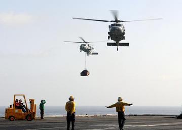Keywords: US Navy 100225-N-4236E-212 An HH-60H Sea Hawk helicopter assigned to the Nightdippers of Helicopter Anti-Submarine Squadron (HS) 5 and an MH-60S Sea Hawk helicopter assigned to the Chargers of Helicopter Sea Combat Squadron (HS.jpg en GULF OF OMAN Feb 25 2010 An HH-60H Sea Hawk helicopter assigned to the Nightdippers of Helicopter Anti-Submarine Squadron HS 5 and an MH-60S Sea Hawk helicopter assigned to the Chargers of Helicopter Sea Combat Squadron HSC 26 perform a vertical replenishment between the Military Sealift Command fleet combat support ship USNS Supply T-AOE 6 and the Nimitz-class aircraft carrier USS Dwight D Eisenhower CVN 69 Dwight D Eisenhower is conducting a scheduled six-month deployment as a part of the on-going rotation of forward-deployed forces U S Navy photo by Mass Communication Specialist 3rd Class Chad R Erdmann/Released 2010-02-25 100225-N-4236E-212 Navy http //www navy mil/view_image asp id 82433 U S Navy photo by Mass Communication Specialist 3rd Class Chad R Erdmann PD-USGov-Military-Navy Flight deck of USS Dwight D Eisenhower CVN-69 Aboard USNS Supply T-AOE-6 Helicopter Sea Combat Squadron 26 United States Navy |