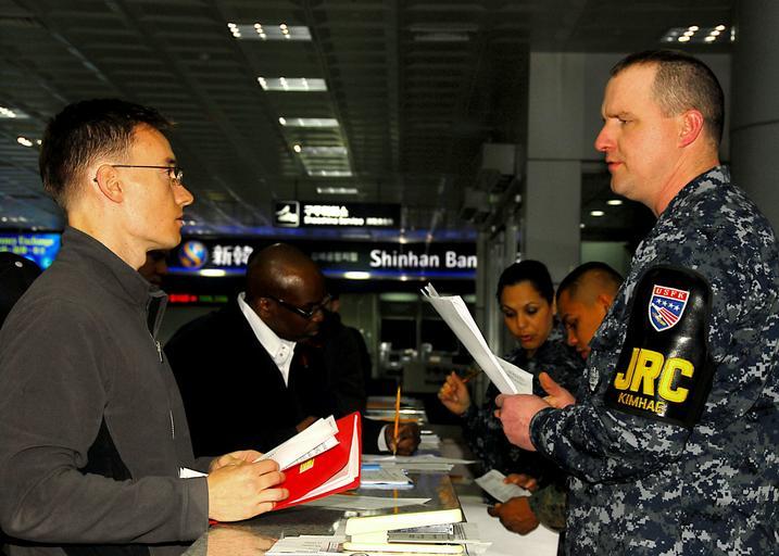 Keywords: US Navy 100306-N-9573A-018 Equipment Operator 2nd Class Daniel O'Bryant helps a Sailor at Gimhae International Airport during Key Resolve-Foal Eagle 2010.jpg en CHINHAE Republic of Korea March 6 2010 Equipment Operator 2nd Class Daniel O'Bryant a Navy Reserve component Sailor assigned to the Joint Reception Center Chinhae helps a Sailor at Gimhae International Airport during Key Resolve/Foal Eagle 2010 There are five Joint Reception Centers throughout the Korean peninsula supporting about 26 000 Sailors Airmen Soldiers Marines and civilians U S Navy photo by Mass Communication Specialist 1st Class Bobbie G Attaway/Released 2010-03-06 100306-N-9573A-018 Navy http //www navy mil/view_image asp id 82844 U S Navy photo by Mass Communication Specialist 1st Class Bobbie G Attaway PD-USGov-Military-Navy Images from US Navy location BUSAN Korea Gimhae International Airport March 2010 in South Korea |