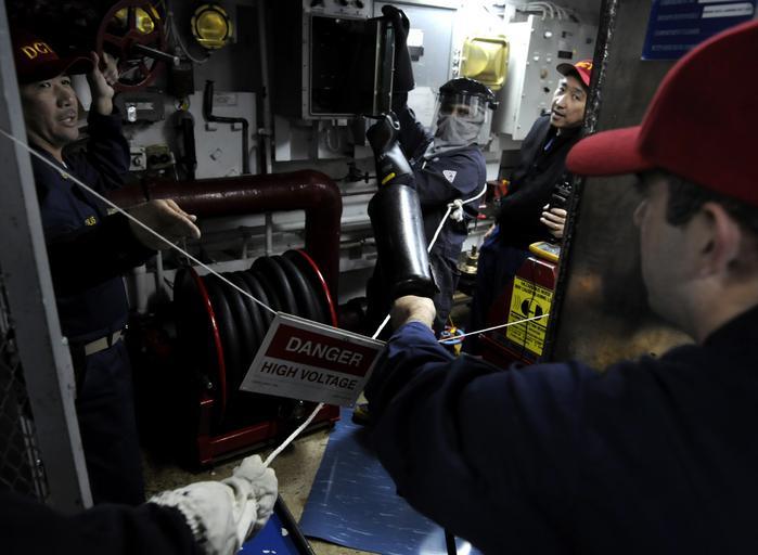 | Keywords: US Navy 100311-N-7280V-204 Chief Electrician's Mate Mateo Canlas and Master Chief Electrician's Mate Ador Barcega direct Hull Maintenance Technician 3rd Class Alex Bonner and Electrician's Mate 3rd Class Gyanand Sookram during.jpg en PACIFIC OCEAN March 11 2010 Chief Electrician's Mate Mateo Canlas left and Master Chief Electrician's Mate Ador Barcega far right damage control training team DCTT members direct Hull Maintenance Technician 3rd Class Alex Bonner and Electrician's Mate 3rd Class Gyanand Sookram during a casualty power drill aboard the U S 7th Fleet command ship USS Blue Ridge LCC 19 Blue Ridge and U S 7th Fleet staff are underway in the Western Pacific Ocean for combined forces Exercise Key Resolve/Foal Eagle 2010 a routine peninsula-wide interoperability exercise involving all branches of the U S military and combined international forces U S Navy photo by Mass Communication Specialist 3rd Class Daniel Viramontes/Released 2010-03-11 100311-N-7280V-204 Navy http //www navy mil/view_image asp id 83057 U S Navy photo by Mass Communication Specialist 3rd Class Daniel Viramontes PD-USGov-Military-Navy Aboard USS Blue Ridge LCC-19 Electrician's Mate Hull Maintenance Technician United States Navy |