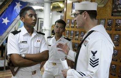 Keywords: US Navy 100405-N-7280V-079 Mass Communication Specialist 1st Class Todd Macdonald gives Sailors from the Royal Malaysian navy a tour of the ship.jpg en KOTA KINABALU Malaysia April 5 2010 Mass Communication Specialist 1st Class Todd Macdonald assigned to the U S 7th Fleet command ship USS Blue Ridge LCC 19 gives Sailors from the Royal Malaysian navy a tour of the ship Blue Ridge is on a scheduled spring deployment U S Navy photo by Mass Communication Specialist 3rd Class Daniel Viramontes/Released 2010-04-05 100405-N-7280V-079 Navy http //www navy mil/view_image asp id 84013 U S Navy photo by Mass Communication Specialist 3rd Class Daniel Viramontes PD-USGov-Military-Navy Aboard USS Blue Ridge LCC-19 Mass Communication Specialist