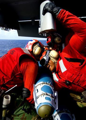 Keywords: US Navy 100601-N-6720T-017 Sailors prepare to lift and mount a 500 lb Guided Bomb Unit to an F-A-18F Super Hornet.jpg en PACIFIC OCEAN June 1 2010 Sailors prepare to lift and mount a 500 lb Guided Bomb Unit GBU-38 to an F/A-18F Super Hornet from the Diamondbacks of Strike Fighter Squadron VFA 102 aboard the aircraft carrier USS George Washington CVN 73 George Washington is underway conducting a combat operations efficiency evaluation in the western Pacific Ocean U S Navy photo by Mass Communication Specialist 3rd Class Adam K Thomas/Released 2010-06-01 100601-N-6720T-017 Navy http //www navy mil/view_image asp id 86276 U S Navy photo by Mass Communication Specialist 3rd Class Adam K Thomas PD-USGov-Military-Navy Aboard USS George Washington CVN-73 Strike Fighter Squadron 102 United States Navy |