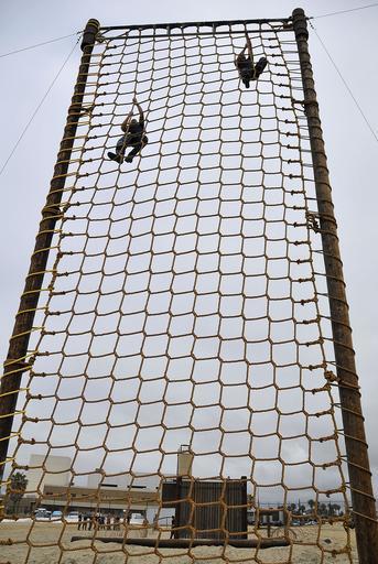 Keywords: US Navy 100610-N-4774B-041 Sailors climb a net wall as part of an obstacle course at Naval Amphibious Base Coronado.jpg en SAN DIEGO June 10 2010 Sailors assigned to Navy Public Affairs Support Element West climb a net wall as part of an obstacle course at Naval Amphibious Base Coronado The obstacle course is a major component for the training of Sailors in special operations and expeditionary forces U S Navy photo by Mass Communication Specialist 2nd Daniel Barker/Released 2010-06-10 100610-N-4774B-041 Navy http //www navy mil/view_image asp id 86943 U S Navy photo by Mass Communication Specialist 2nd Daniel Barker PD-USGov-Military-Navy Naval Amphibious Base Coronado Cargo nets climbing