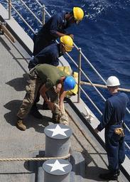 Keywords: US Navy 100621-N-1082Z-048 Sailors and Marines tie stops on a mooring line aboard the amphibious dock landing ship USS Ashland (LSD 48).jpg en U S 5TH FLEET AREA OF REPSONSIBILITY June 21 2010 Sailors and Marines tie stops on a mooring line aboard the amphibious dock landing ship USS Ashland LSD 48 as the ship moors pierside Ashland is part of the Nassau Amphibious Ready Group supporting maritime security operations and theater security cooperation operations in the U S 5th Fleet area of responsibility U S Navy photo by Mass Communication Specialist 2nd Class Jason R Zalasky/Released 2010-06-21 100621-N-1082Z-048 Navy http //www navy mil/view_image asp id 88124 U S Navy photo by Mass Communication Specialist 2nd Class Jason R Zalasky PD-USGov-Military-Navy Aboard USS Ashland LSD-48
