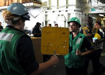 Keywords: US Navy 100707-N-2908M-046 Boatswain's Mate 3rd Class Danielle Thorne gives training on proper signaling for a replenishment at sea to Boatswain's Mate Seaman Afton Patrick aboard USS Kearsarge (LHD 3).jpg en ATLANTIC OCEAN July 7 2010 Boatswain's Mate 3rd Class Danielle Thorne left gives training on proper signaling for a replenishment at sea to Boatswain's Mate Seaman Afton Patrick aboard the amphibious assault ship USS Kearsarge LHD 3 Kearsarge is a part of the Kearsarge Amphibious Ready Group participating in a composite unit training exercise COMPTUEX from Virginia to Florida U S Navy photo by Mass Communication Specialist 3rd Class Joshua Mann/Released 2010-07-07 100707-N-2908M-046 Navy http //www navy mil/view_image asp id 88383 U S Navy photo by Mass Communication Specialist 3rd Class Joshua Mann PD-USGov-Military-Navy Aboard USS Kearsarge LHD-3 |