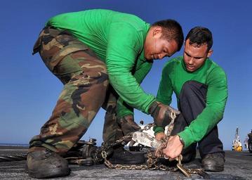Keywords: US Navy 100718-N-5650M-012 Aviation Boatswain's Mates (Equipment) 3rd Class Eliezer Arroyo and Earl Pelitaro attach chains to an arresting wire aboard the aircraft carrier USS Enterprise (CVN 65).jpg en ATLANTIC OCEAN July 18 2010 Aviation Boatswain's Mates Equipment 3rd Class Eliezer Arroyo and Earl Pelitaro attach chains to an arresting wire aboard the aircraft carrier USS Enterprise CVN 65 Enterprise is on a scheduled underway for fleet replacement squadron carrier qualifications and is making preparations for its 21st deployment U S Navy photo by Mass Communication Specialist 3rd Class Tiger Martinez/Released 2010-07-18 100718-N-5650M-012 Navy http //www navy mil/view_image asp id 88929 U S Navy photo by Mass Communication Specialist 3rd Class Tiger Martinez PD-USGov-Military-Navy Aboard USS Enterprise CVN-65 Aviation Boatswain's Mates Equipment Arrestor cables |