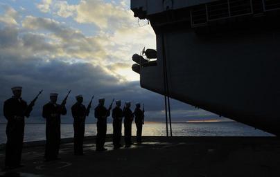| Keywords: US Navy 100721-N-3595W-007 Sailors present arms during a sunrise burial at sea aboard USS Dwight D. Eisenhower (CVN 69).jpg en ATLANTIC OCEAN July 21 2010 Sailors assigned to the aircraft carrier USS Dwight D Eisenhower CVN 69 present arms during a sunrise burial at sea The Eisenhower Carrier Strike Group is deployed as part of an-ongoing rotation of forward-deployed forces to support maritime security operations in the U S 5th Fleet areas of responsibility US Navy photo by Mass Communication Specialist 2nd Class Gina K Wollman/Released 2010-07-21 100721-N-3595W-007 Navy http //www navy mil/view_image asp id 89161 U S Navy photo PD-USGov-Military-Navy Aboard USS Dwight D Eisenhower CVN-69 Sea burials |