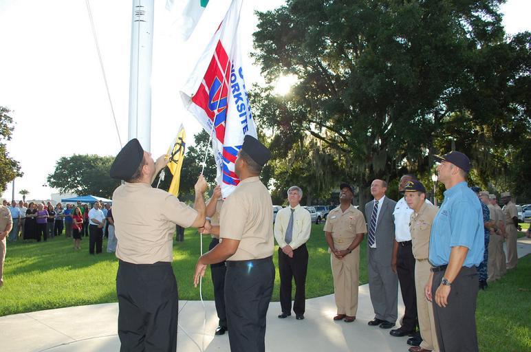 | Keywords: US Navy 100818-N-3436L-002 Sailors raise the new Occupational Safety and Health Administration (OSHA) flag for achieving OSHA's Voluntary Protection Program.jpg en JACKSONVILLE Fla Aug 18 2010 Sailors assigned to Naval Air Station Jacksonville NAS Jax raise the new Occupational Safety and Health Administration OSHA flag for achieving OSHA's Voluntary Protection Program Star status during a ceremony at NAS Jax Looking on are OSHA Representative Jeffrey Romeo right Capt Jeffrey Maclay commanding officer of NAS Jax; NAS Jax Union Representative Robert Winchester; Bruce Cwalina executive director of Commander Navy Region Southeast; Rear Adm Arthur Johnson commander of Naval Safety Center and Ron Williamson NAS Jax safety officer U S Navy photo by Kaylee LaRocque/Released 2010-08-18 100818-N-3436L-002 Navy http //www navy mil/view_image asp id 90646 U S Navy photo by Kaylee LaRocque PD-USGov-Military-Navy Images from US Navy location Jacksonville Florida |
