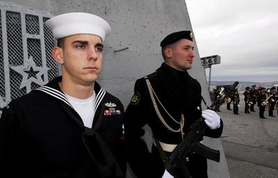 | Keywords: US Navy 100907-N-7638K-018 Yeoman 3rd Class Jeremy Tenney stands at attention alongside sailors from the Russian Armed Forces during a wreath layin.jpg en MURMANSK Russia Sept 7 2010 Yeoman 3rd Class Jeremy Tenney from Lexington Md a member of the Oliver Hazard Perry-class guided-missile frigate USS Taylor FFG 50 color guard stands at attention alongside sailors from the Russian Armed Forces during a wreath laying ceremony at the Alyosha World War II Monument to honor fallen soldiers from World War II Taylor is in Murmansk participating in several commemorative events marking the 65th anniversary of the end of world War II Taylor is on a scheduled deployment in the U S 6th Fleet area of responsibility U S Navy photo by Mass Communications Specialist 1st Class Edward Kessler/Released 2010-09-07 100907-N-7638K-018 Navy http //www navy mil/view_image asp id 91396 U S Navy photo by Mass Communications Specialist 1st Class Edward Kessler PD-USGov-Military-Navy USS Taylor FFG-50 Memorial to Defenders of the Soviet Arctic during the Great Patriotic War |