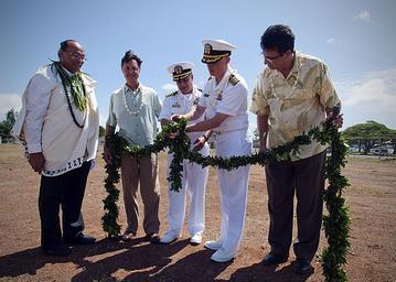 Keywords: US Navy 101005-N-0995C-032 Capt. John Coronado, along with Capt. Rick Kitchens, untie the Maile Lei at the Ford Island Child Development Center gr.jpg en FORD ISLAND Hawaii Oct 5 2010 Capt John Coronado commander of Naval Facilities Engineering Command NAVFAC Hawaii along with Capt Rick Kitchens commander of Joint Base Pearl Harbor-Hickam untie the Maile Lei at the Ford Island Child Development Center groundbreaking ceremony The CDC is scheduled to be completed by Jan 2012 U S Navy photo by Mass Communication Specialist 2nd Class Eric J Cutright/Released 2010-10-05 101005-N-0995C-032 Navy http //www navy mil/view_image asp id 92449 U S Navy photo by Mass Communication Specialist 2nd Class Eric J Cutright PD-USGov-Military-Navy Ford Island People wearing leis |
