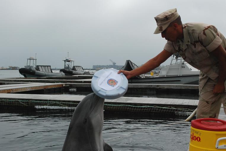 Keywords: US Navy 101013-N-0363B-063 Marine mammal handler Gunner's Mate 3rd Class Manuel Gonzalez and a bottlenose dolphin, both assigned to Explosive Ordna.jpg en CORONADO Calif Oct 13 2010 Marine mammal handler Gunner's Mate 3rd Class Manuel Gonzalez and a bottlenose dolphin both assigned to Explosive Ordnance Disposal Mobile Unit EODMU 1 commemorate the U S Navy's 235th birthday The U S Navy Marine Mammal Program uses bottlenose dolphins operated by EODMU-1 to locate and mark mines that are on the sea floor tethered in the water column or in shallow water The program is administered by Space and Naval Warfare Systems Center Pacific U S Navy photo by Lt David Bennett/Released 2010-10-13 101013-N-0363B-063 Navy http //www navy mil/view_image asp id 92773 U S Navy photo by Lt David Bennett PD-USGov-Military-Navy Images from US Navy location CORONADO Calif United States Navy Marine Mammal Program Tursiops truncatus captive Birthday ceremonies of the United States Navy Explosive Ordnance Disposal Mobile Unit 1 |