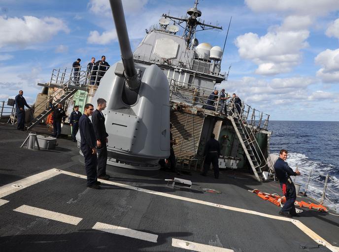Keywords: US Navy 101024-N-3885H-054 Sailors aboard the guided-missile cruiser USS Philippine Sea (CG 58) lean with the ship as it performs high-speed rudder.jpg en ATLANTIC OCEAN Oct 24 2010 Sailors aboard the guided-missile cruiser USS Philippine Sea CG 58 lean with the ship as it performs high-speed rudder checks Philippine Sea is part of the George H W Bush Carrier Strike Group and is conducting training operations in the Atlantic Ocean U S Navy photo by Mass Communication Specialist 3rd Class Nicholas Hall/Released 2010-10-24 101024-N-3885H-054 Navy http //www navy mil/view_image asp id 93238 U S Navy photo by Mass Communication Specialist 3rd Class Nicholas Hall PD-USGov-Military-Navy Aboard USS Philippine Sea CG-58 5 /54 caliber Mark 45 gun |