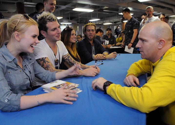 Keywords: US Navy 101105-N-7095C-345 Cheyenne Kimball, of the country music band Gloriana, talks with Aviation Boatswain's Mate (Handling) 1st Class Todd A.jpg en ARABIAN GULF Nov 5 2010 Cheyenne Kimball of the country music band Gloriana talks with Aviation Boatswain's Mate Handling 1st Class Todd A Rogers during an autograph session for Sailors aboard the aircraft carrier USS Abraham Lincoln CVN 72 The band later performed a concert for Sailors as part of a program sponsored by the Abraham Lincoln morale welfare and recreation program The Abraham Lincoln Carrier Strike Group is deployed to the U S 5th Fleet area of responsibility supporting maritime security operations and theater security cooperation efforts U S Navy photo by Mass Communication Specialist 2nd Class Seth Clarke/Released 2010-11-05 101105-N-7095C-345 Navy http //www navy mil/view_image asp id 93794 U S Navy photo by Mass Communication Specialist 2nd Class Seth Clarke PD-USGov-Military-Navy Aboard USS Abraham Lincoln CVN-72 Cheyenne Kimball Arm tattoos Gloriana |