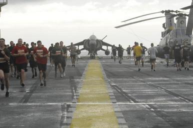 | Keywords: US Navy 101206-N-1485C-512 Sailors and Marines participate in a half marathon race aboard USS Peleliu (LHA 5).jpg en PACIFIC OCEAN Dec 6 2010 Sailors and Marines participate in a half marathon race sponsored by Helicopter Marine Medium Squadron HMM 165 Reinforced of the embarked 15th Marine Expeditionary Unit 15th MEU during inclement weather aboard the amphibious assault ship USS Peleliu LHA 5 The race raised more than 3600 for the Semper Fi Fund which helps support injured Marines Peleliu is the flagship of the Peleliu Amphibious Ready Group which is returning to its homeport of San Diego after a seven-month deployment U S Navy photo by Mass Communication Specialist 3rd Class Ian Campbell/Released 2010-12-06 101206-N-1485C-512 Navy http //www navy mil/view_image asp id 95477 U S Navy photo by Mass Communication Specialist 3rd Class Ian Campbell PD-USGov-Military-Navy Aboard USS Peleliu LHA-5 Half marathons |