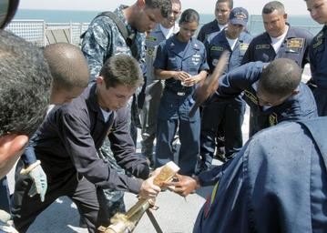 Keywords: US Navy 110203-A-5566B-011 A Colombian coast guardsman hammers a wedge into a pipe during a soft patch pipe repair class aboard the Whidbey Island.jpg en COVENAS Colombia Feb 3 2011 A Colombian coast guardsman hammers a wedge into a pipe during a soft patch pipe repair class aboard the Whidbey Island-class amphibious dock landing ship USS Gunston Hall LSD 44 The subject matter expert exchange was part of the Amphibious Southern Partnership SPS 2011 SPS is an annual deployment of U S ships to the U S Southern Command area of responsibility in the Caribbean and Latin America U S Army photo by Spc Gavriel Bar-Tzur/Released 2011-02-03 110203-A-5566B-011 Navy http //www navy mil/view_image asp id 97283 U S Army photo by Spc Gavriel Bar-Tzur PD-USGov-Military-Navy Aboard USS Gunston Hall LSD-44 |
