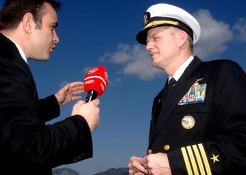 Keywords: US Navy 110209-N-7326M-180 Capt. Dee L. Mewbourne, commanding officer of the aircraft carrier USS Enterprise (CVN 65), is interviewed by a Turkish.jpg en MARMARIS Turkey Feb 9 2011 Capt Dee L Mewbourne commanding officer of the aircraft carrier USS Enterprise CVN 65 is interviewed by a Turkish reporter during a port visit Enterprise is deployed as part of the Enterprise Carrier Strike Group supporting maritime security operations and theater security cooperation efforts in the U S 5th and 6th Fleet areas of responsibility U S Navy photo by Mass Communication Specialist Seaman Daniel J Meshel/Released 2011-02-09 110209-N-7326M-180 Navy http //www navy mil/view_image asp id 97540 U S Navy photo by Mass Communication Specialist Seaman Daniel J Meshel PD-USGov-Military-Navy Aboard USS Enterprise CVN-65 Military people with microphones Journalists from Turkey Dee L Mewbourne |