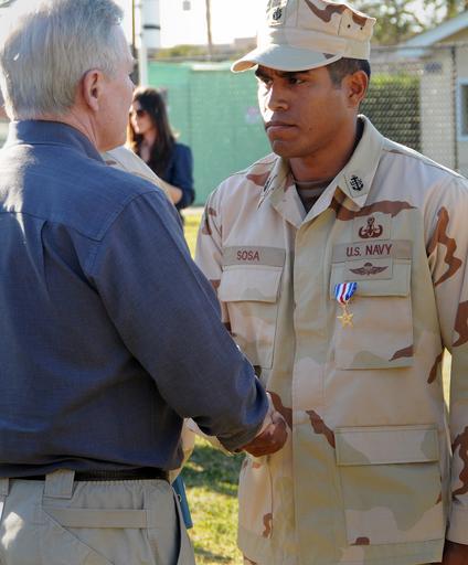 | Keywords: US Navy 110211-N-DO222-020 Secretary of the Navy (SECNAV) the Honorable Ray Mabus congratulates Chief Explosive Ordinance Disposal technician Gerar.jpg en CORONADO Calif Feb 11 2011 Secretary of the Navy SECNAV the Honorable Ray Mabus congratulates Chief Explosive Ordinance Disposal technician Gerardo Sosa after presenting him with the Silver Star medal at Naval Special Warfare Group 1 Sosa was awarded the medal for clearing 200 yards of a suspected mine field by hand during combat operations in Afghanistan while deployed with SEAL Team 7 U S Navy photo by Mass Communication Specialist 2nd Class Chris Morton/Received 110211-N-DO222-020 Navy http //www navy mil/view_image asp id 97472 U S Navy photo PD-USGov-Military-Navy Images from US Navy location CORONADO Calif Ray Mabus Presentation of the Silver Star United States July 2009 in the United States 2009 in California Naval Special Warfare Group One SEAL Team 7 |