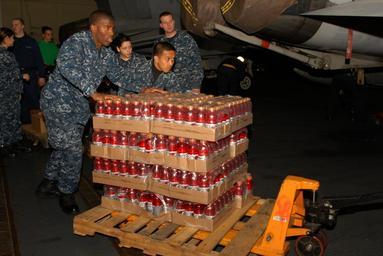 | Keywords: US Navy 110314-N-RG360-048 Sailors aboard the aircraft carrier USS Ronald Reagan (CVN 76) move cases of sports drinks and water in preparation to s.jpg en PACIFIC OCEAN March 14 2011 Sailors aboard the aircraft carrier USS Ronald Reagan CVN 76 move cases of sports drinks and water in preparation to support disaster relief efforts The Ronald Reagan Carrier Strike Group is conducting disaster relief operations in the coastal waters off northern Japan in the wake of an 8 9 magnitude earthquake and subsequent tsunami U S Navy photo by Mass Communication Specialist 2nd Class Melissa Russell/Released 2011-03-14 110314-N-RG360-048 Navy http //www navy mil/view_image asp id 98422 U S Navy photo by Mass Communication Specialist 2nd Class Melissa Russell Personality rights PD-USGov-Military-Navy USS Ronald Reagan CVN-76 humanitarian aid Operation Tomodachi in March 2011 Sports drinks Pallet jacks |