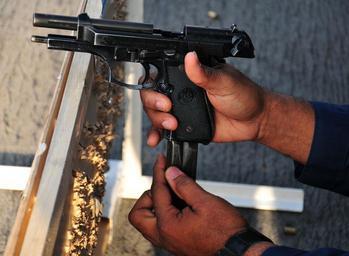 Keywords: US Navy 110406-N-ZS026-156 Logistics Specialist 2nd Class Jermaine Jackson reloads a 9mm pistol while behind cover during a small arms practical we.jpg en ARABIAN SEA April 6 2011 Logistics Specialist 2nd Class Jermaine Jackson reloads a 9mm pistol while behind cover during a small arms practical weapons qualification course aboard the amphibious assault ship USS Boxer LHD 4 Boxer is assigned to Combined Task Force CTF 151 a multi-national coalition conducting counter piracy and maritime security operations in the Arabian Sea Gulf of Aden and Somali Basin U S Navy photo by Mass Communication Specialist 3rd Class Trevor Welsh/Released 2011-04-06 110406-N-ZS026-156 Navy http //www navy mil/view_image asp id 99595 U S Navy photo by Mass Communication Specialist 3rd Class Trevor Welsh PD-USGov-Military-Navy Aboard USS Boxer LHD-4 Firearms training in the United States Navy M9 pistol People with magazines firearms Reloading firearms