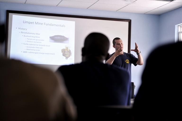| Keywords: US Navy 110606-N-KB666-245 Navy Diver 2nd Class Zach Dojaquez, assigned to Mobile Dive and Salvage Unit (MDSU) 2, gives a lecture to foreign divers.jpg en BRIDGETOWN Barbados June 6 2011 Navy Diver 2nd Class Zach Dojaquez assigned to Mobile Dive and Salvage Unit MDSU 2 gives a lecture to foreign divers on anti-terrorism force protection diving procedures MDSU-2 is participating in Navy Diver Southern Partnership Station a multi-national partnership engagement designed to increase operability and partner nation capability through diving operations U S Navy photo by Mass Communication Specialist 2nd Class Gregory N Juday/Released 2011-06-06 110606-N-KB666-245 Navy http //www navy mil/view_image asp id 102218 U S Navy photo by Mass Communication Specialist 2nd Class Gregory N Juday PD-USGov-Military-Navy Images from US Navy location Bridgetown Barbados |