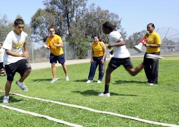 MAKE A MEME View Large Image Navy 110622-N-CW427-033 Sailors cheer students while they complete an obstacle course during a physical fitness field day.jpg en SAN DIEGO June 22 2011 Hospital Corpsman 3rd Class Erick Adkins left Culinary Specialist 1st Class Rachel Mares ...