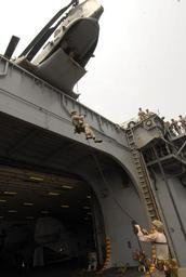 | Keywords: US Navy 110702-N-DB458-037 Marines assigned to Force Reconnaissance, 13th Marine Expeditionary Unit (13th MEU), conduct rappel training.jpg en GULF OF ADEN July 2 2011 Marines assigned to Force Reconnaissance 13th Marine Expeditionary Unit 13th MEU conduct rappel training from the flight deck to an aircraft elevator aboard the amphibious assault ship USS Boxer LHD 4 Boxer and the 13th MEU are underway supporting maritime security operations and theater security cooperation efforts in the U S 5th Fleet area of responsibility U S Navy photo by Mass Communication Specialist 3rd Class Anna Kiner/Released 2011-07-02 110702-N-DB458-037 Navy http //www navy mil/view_image asp id 103971 U S Navy photo by Mass Communication Specialist 3rd Class Anna Kiner PD-USGov-Military-Navy Aboard USS Boxer LHD-4 |