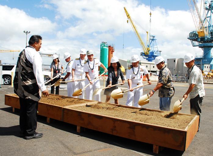 | Keywords: US Navy 110706-N-XZ434-075 Kahu Kawila Clark presides over the turning of soil by shovel-holders Michelle Au, left, welder apprentice at Pearl Harb.jpg en PEARL HARBOR July 6 2011 Kahu Kawila Clark presides over the turning of soil by shovel-holders Michelle Au left welder apprentice at Pearl Harbor Naval Shipyard; Capt Jeffrey James commander of Joint Base Pearl Harbor-Hickam; Rear Adm Dixon Smith commander of Navy Region Hawaii and Naval Surface Group Middle Pacific; Capt Brian Osgood commander of Pearl Harbor Naval Shipyard; Jennifer Sabas chief of staff for U S Sen Daniel Inouye; Fooney Freestone president of Nan Inc ; and Don Bongo president of Metal Trades Council during a ground breaking ceremony for a 15 8 million production services support facility at Pearl Harbor Naval Shipyard U S Navy photo by Katie Vanes/Released 2011-07-06 110706-N-XZ434-075 Navy http //www navy mil/view_image asp id 103782 U S Navy photo by Katie Vanes PD-USGov-Military-Navy People at Pearl Harbor Images from US Navy location Pearl Harbor Hawaii 2011 in Pearl Harbor |