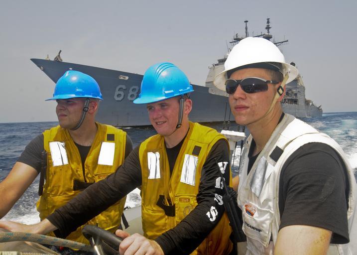 Keywords: US Navy 110709-N-YM590-051 Sailors guide a rigid-hull inflatable boat past the guided-missile cruiser USS Anzio (CG 68).jpg en GULF OF ADEN July 9 2011 Boatswain's Mate 3rd Class Steven Jones left the coxswain under instruction Boatswain's Mate 3rd Class Nick Connelly the coxswain and Ensign Austin Ayers the boat officer guide a rigid-hull inflatable boat past the guided-missile cruiser USS Anzio CG 68 during boat operations training Anzio is assigned to Combined Task Force 151 a multinational mission-based task force established by Combined Maritime Forces in January 2009 to conduct counter-piracy operations in the Red Sea Gulf of Aden Somali Basin and Arabian Sea U S Navy photo by Mass Communication Specialist 2nd Class Brian M Brooks/Released 2011-07-09 110709-N-YM590-051 Navy http //www navy mil/view_image asp id 104186 U S Navy photo by Mass Communication Specialist 2nd Class Brian M Brooks PD-USGov-Military-Navy USS Anzio CG-68 Men with hard hats High-visibility clothing |