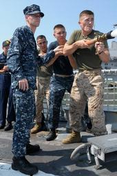 | Keywords: US Navy 110726-N-GZ228-130 Lt. j.g. Dirk Wooten guides midshipmen as they spray fire hose during a training exercise aboard USS Nitze (DDG 94).jpg en NORFOLK July 26 2011 Lt j g Dirk Wooten guides midshipmen as they spray fire hose during a training exercise aboard the guided-missile destroyer USS Nitze DDG 94 Navy ROTC midshipmen are taking part in Career Orientation Training which shows options available to the future officers U S Navy photo by Mass Communication Specialist Seaman Apprentice Jesse Monford/Released 2011-07-26 110726-N-GZ228-130 Navy http //www navy mil/view_image asp id 104867 U S Navy photo by Mass Communication Specialist Seaman Apprentice Jesse Monford PD-USGov-Military-Navy Aboard USS Nitze DDG-94 Fire hoses Firefighting training in the United States Navy Images from US Navy location Norfolk Va July 2011 in the United States Men with glasses Men facing right and looking right Military people in 2011 Naval Reserve Officers Training Corps Navy Working Uniform in 2011 People of the United States in 2011 Standing men 2011 in Virginia 2011 photographs Naval officers of the United States 26 July |
