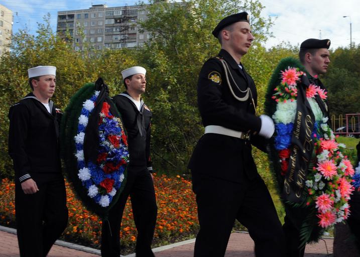 | Keywords: US Navy 110903-N-ON468-038 U.S. Navy Sailors march behind Russian sailors during a wreath-laying ceremony at the Kursk submarine memorial in Murman.jpg en MURMANSK Russia Sept 3 2011 Sonar Technician Surface 2nd Class Matthew Greenwood left and Hospital Corpsman 2nd Class Eric Nobriga both assigned to the guided-missile frigate USS Carr FFG 52 march behind Russian sailors during a wreath-laying ceremony at the Kursk submarine memorial in Murmansk The memorial honors the Russian submarine Kursk which sank in the Barents Sea on Aug 13 2000 Carr is on a three-month deployment supporting maritime security operations and theater security cooperation efforts in the U S 6th Fleet area of responsibility U S Navy photo by Mass Communication Specialist 2nd Class Jeff Troutman/Released 2011-09-03 110903-N-ON468-038 Navy http //www navy mil/view_image asp id 106886 U S Navy photo by Mass Communication Specialist 2nd Class Jeff Troutman PD-USGov-Military-Navy USS Carr FFG-52 Memorial wreaths |