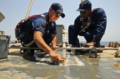 Keywords: US Navy 110915-N-YM590-004 Quartermaster 3rd Class Michael Martinez, left, and Quartermaster 3rd Class Jamarcus Hardy clean the top of the bridge.jpg en GULF OF ADEN Sept 15 2011 Quartermaster 3rd Class Michael Martinez left and Quartermaster 3rd Class Jamarcus Hardy clean the top of the bridge aboard the guided-missile cruiser USS Anzio CG 68 Anzio is assigned to Combined Task Force 151 a multi-national mission-based task force established by the Combined Maritime Forces in January 2009 to conduct counter-piracy operations in the Red Sea Gulf of Aden Somali Basin and Arabian Sea U S Navy photo by Mass Communication Specialist 2nd Class Brian M Brooks/Released 2011-09-15 110915-N-YM590-004 Navy http //www navy mil/view_image asp id 107536 U S Navy photo by Mass Communication Specialist 2nd Class Brian M Brooks PD-USGov-Military-Navy USS Anzio CG-68 |
