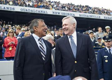 Keywords: US Navy 111001-N-AC887-002 Secretary of the Navy (SECNAV) Ray Mabus and Secretary of Defense (SECDEF) Leon Panetta prepare to take the field for th.jpg en ANNAPOLIS Oct 1 2011 Secretary of the Navy SECNAV Ray Mabus and Secretary of Defense SECDEF Leon Panetta prepare to take the field for the opening coin toss before the NCAA football game between the U S Air Force Academy and the U S Naval Academy at Navy Marine Corps Stadium The Midshipmen lost to the Cadets 35-34 in overtime U S Navy photo by Chief Mass Communication Specialist Sam Shavers/Released 2011-10-01 111001-N-AC887-002 Navy http //www navy mil/view_image asp id 108157 U S Navy photo by Chief Mass Communication Specialist Sam Shavers PD-USGov-Military-Navy Navy-Marine Corps Memorial Stadium Leon Panetta in 2011 Ray Mabus |