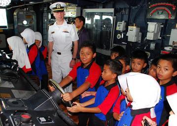 | Keywords: US Navy 111004-N-VP123-071 Lt. j.g. Artemas Richardson, a public affairs officer aboard the Arleigh Burke-class guided-missile destroyer USS Dewey.jpg en MUARA Brunei Oct 4 2011 Lt j g Artemas Richardson a public affairs officer aboard the Arleigh Burke-class guided-missile destroyer USS Dewey DDG 105 watches 5th grade students from Royal Brunei Navy Primary School operate the ship's steering console during a tour of the bridge The tour was part of Cooperation Afloat Readiness and Training CARAT Brunei 2011 CARAT is a series of bilateral exercises held annually in Southeast Asia to strengthen relationships and to enhance force readiness U S Navy photo by Lt Cmdr Mike Morley/Released 2011-10-04 111004-N-VP123-071 Navy http //www navy mil/view_image asp id 108391 U S Navy photo by Lt Cmdr Mike Morley PD-USGov-Military-Navy USS Dewey DDG-105 Education in Brunei |