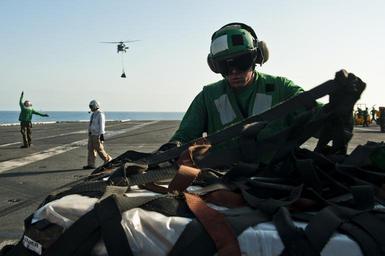 Keywords: US Navy 111013-N-BT887-308 Logistics Specialist Seaman Robert Marlin unwraps cargo during a vertical replenishment aboard the Nimitz-class aircraft.jpg en ARABIAN SEA Oct 13 2011 Logistics Specialist Seaman Robert Marlin unwraps cargo during a vertical replenishment aboard the Nimitz-class aircraft carrier USS John C Stennis CVN 74 John C Stennis is deployed to the U S 5th Fleet area of responsibility conducting maritime security operations and support missions as part of Operations Enduring Freedom and New Dawn U S Navy photo by Mass Communication Specialist 3rd Class Benjamin Crossley/Released 2011-10-13 111013-N-BT887-308 Navy http //www navy mil/view_image asp id 108824 U S Navy photo by Mass Communication Specialist 3rd Class Benjamin Crossley PD-USGov-Military-Navy Aboard USS John C Stennis CVN-74