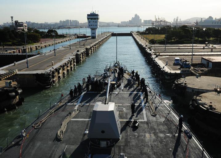 Keywords: US Navy 111017-N-ED900-088 The Arleigh Burke-class guided-missile destroyer USS Pinckney (DDG 91) pulls into a lock gate to accommodate for differe.jpg en INCHEON Republic of Korea Oct 17 2011 The Arleigh Burke-class guided-missile destroyer USS Pinckney DDG 91 pulls into a lock gate to accommodate for different water levels as the ship makes way to port in Incheon Republic of Korea Pinckney is in the U S 7th Fleet area of responsibility U S Navy photo by Mass Communication Specialist 2nd Class Eddie Harrison/Released 2011-10-17 111017-N-ED900-088 Navy http //www navy mil/view_image asp id 108953 U S Navy photo by Mass Communication Specialist 2nd Class Eddie Harrison PD-USGov-Military-Navy Aboard USS Pinckney DDG-91 Lock gates Incheon |